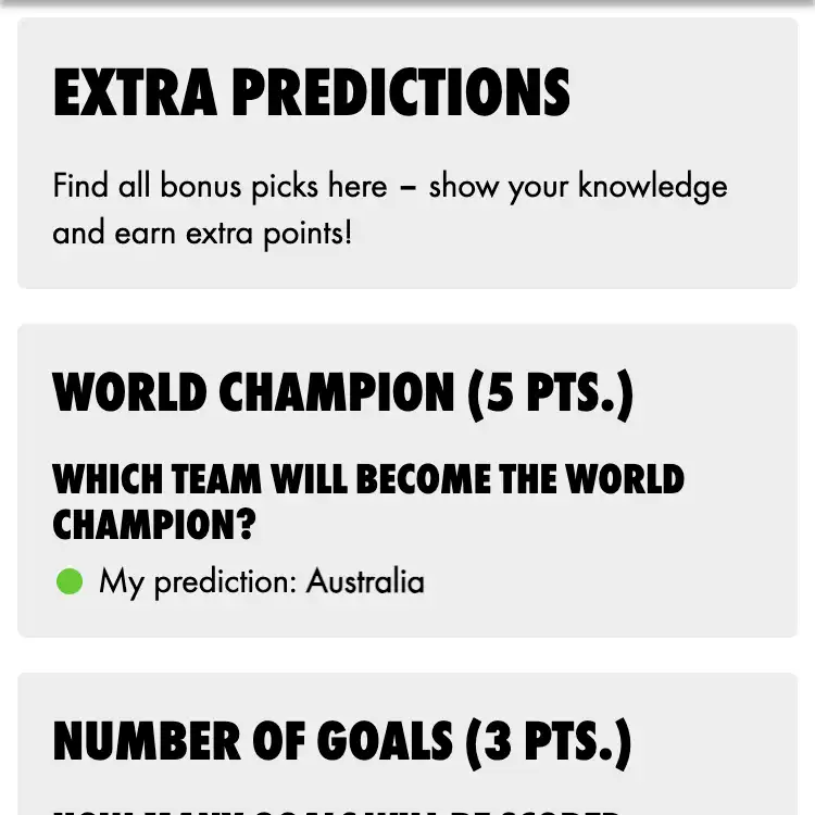 From “Who will win the tournament?” to “How far will Team X get?” — additional questions keep engagement high.